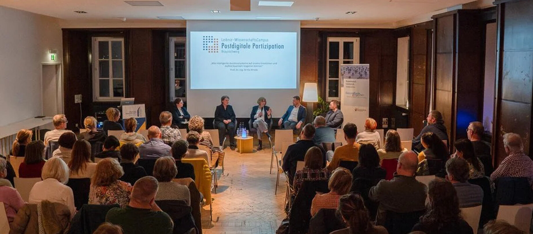 Am vergangenen Donnerstagabend verwandelte sich der fünfte Stock im Haus der Wissenschaft in Braunschweig in ein Forum für die Zukunft der sozialen und medizinischen Versorgung. Unter dem Titel, „Wie intelligente Assistenzsysteme auf unsere Emotionen und Aufmerksamkeit reagieren können“, lud Prof. Dr. Sandra Verena Müller für den Leibniz WissenschaftsCampus Postdigitale Partizipation Braunschweig zu einem Vortrag mit anschließender Podiumsdiskussion ein, der auf enormes Interesse stieß. Der Saal war bis auf den letzten Platz gefüllt und bis in den späten Nachmittag hinein erreichten die Veranstalter Anfragen nach zusätzlichen Plätzen.